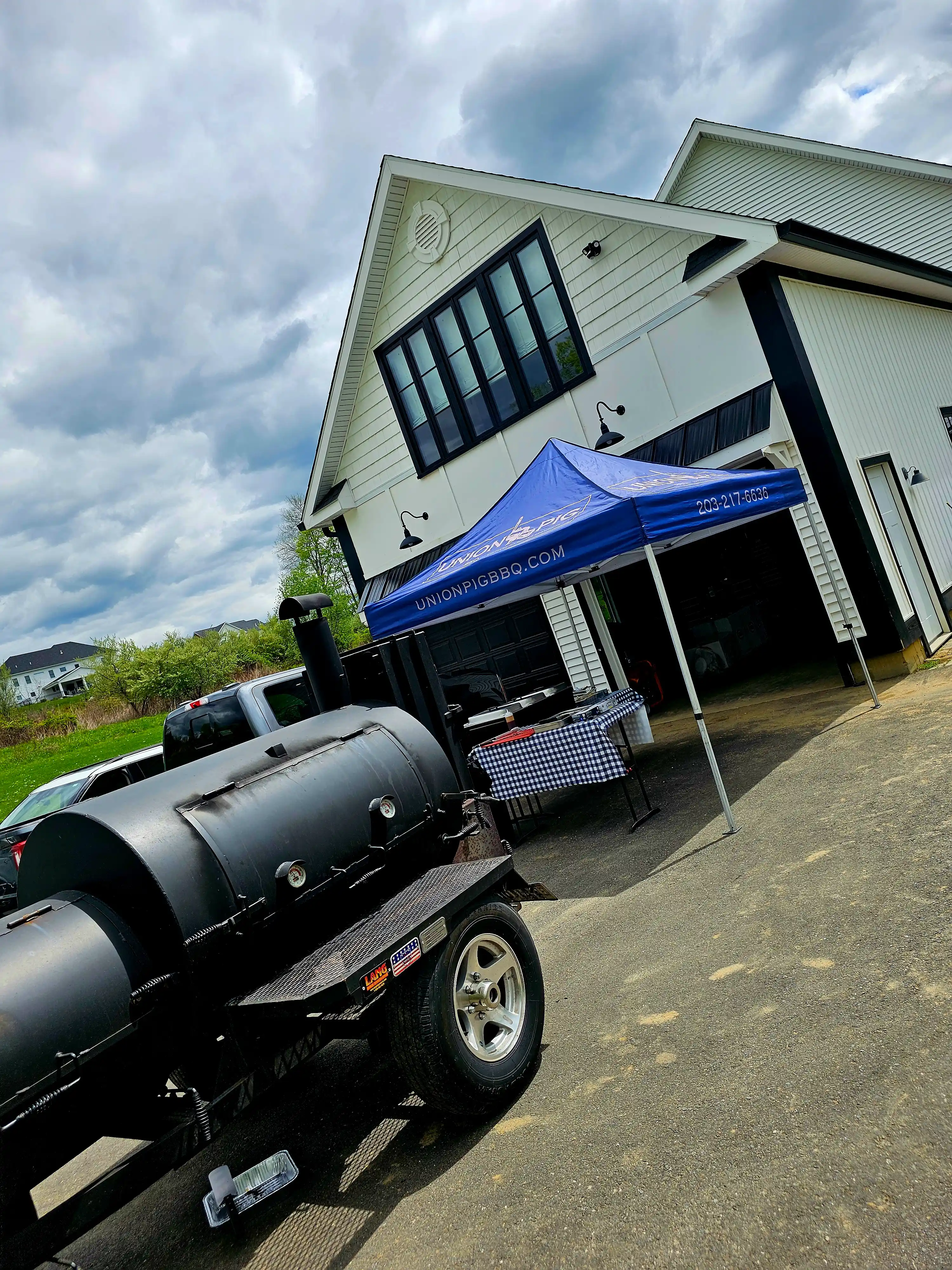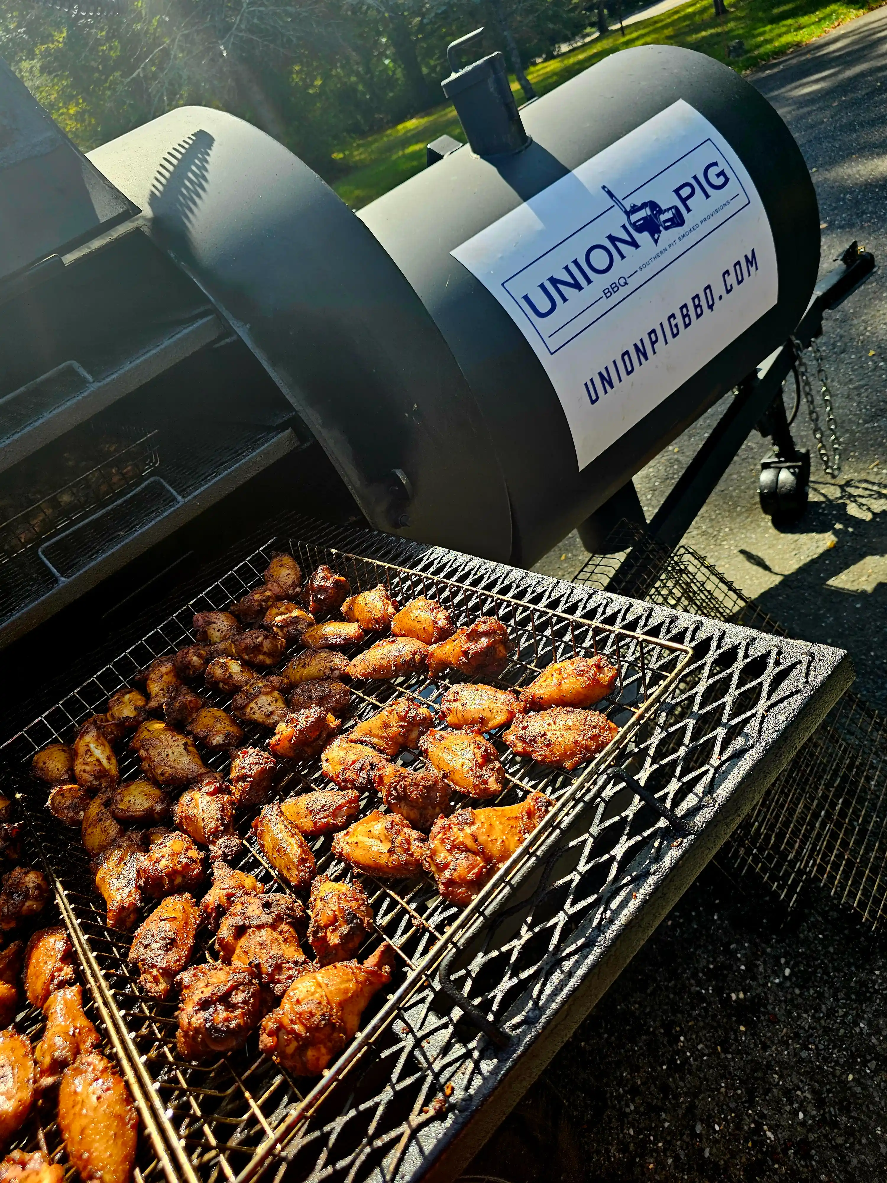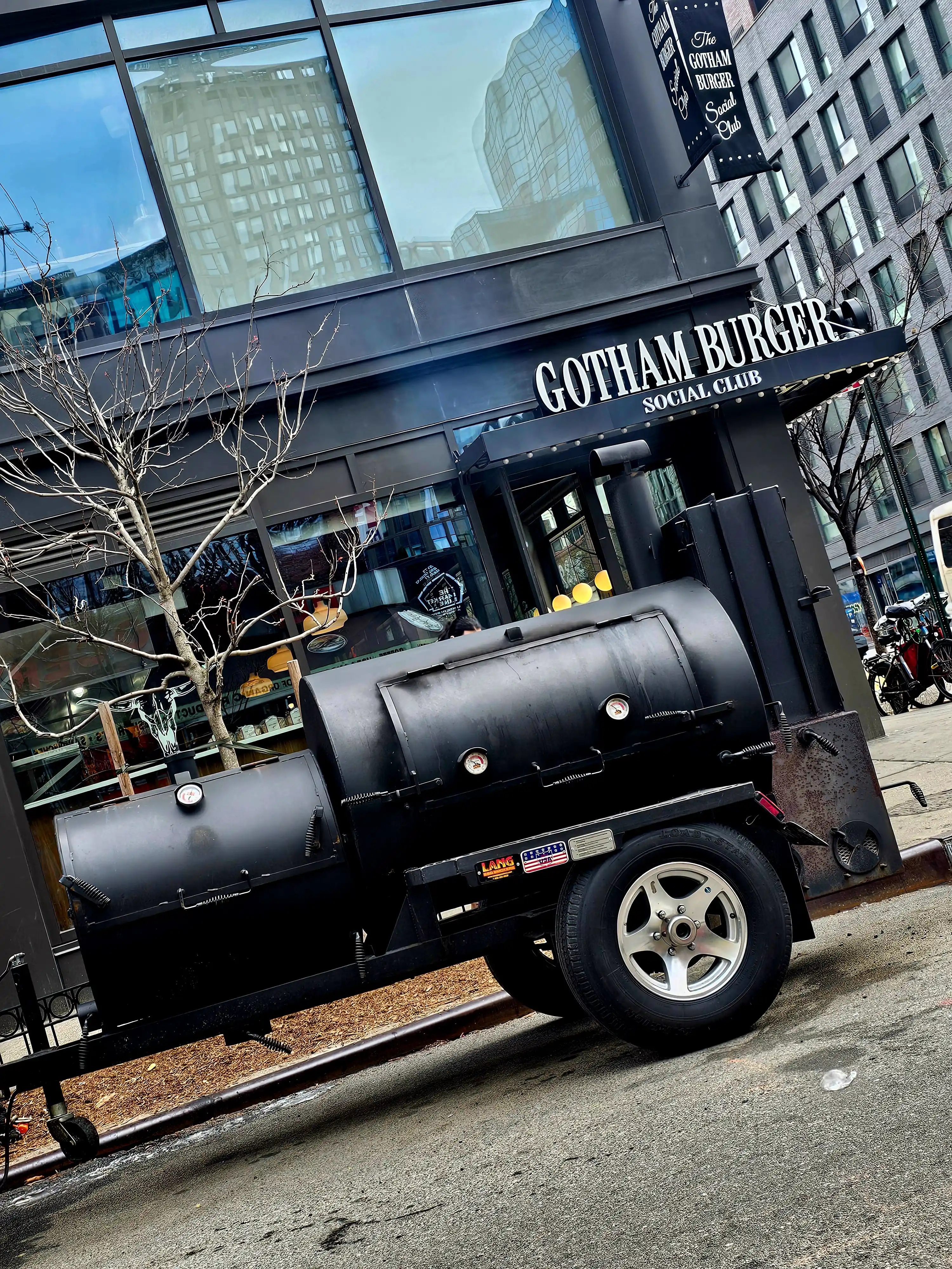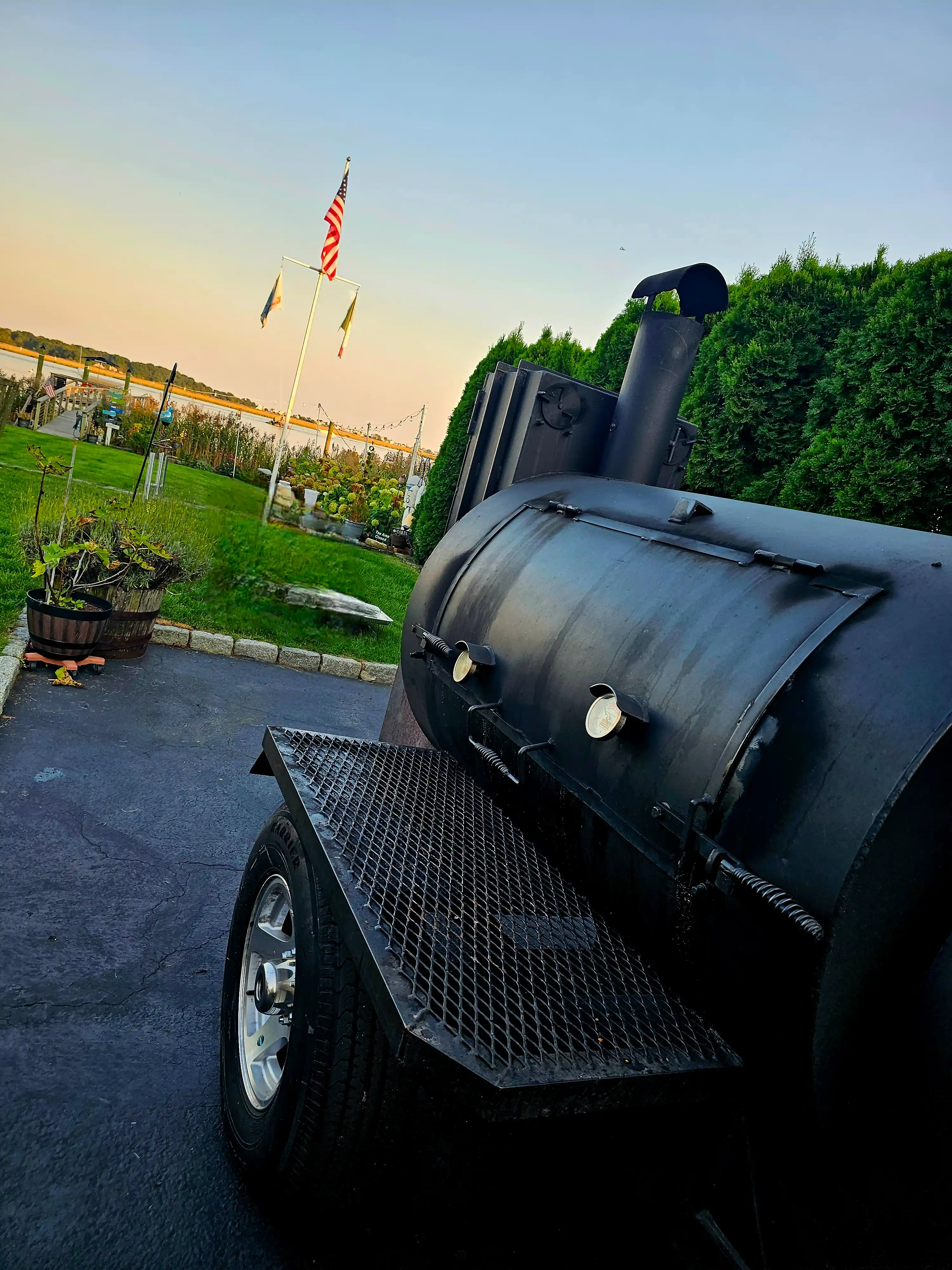 Lang BBQ Smokers®, made in Nahunta, Georgia since 1988, are the originators of the reverse flow, off-set firebox design. Built with heavy 1/4-inch plate steel, these "stick burners" circulate clean, even heat around the meat — sizzling off fat for a healthy, lean barbecue flavor. Kevin's 84 Fat Boy model also features a side char-griller, perfect for steaks, oysters, vegetables, and more.